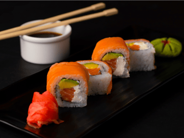 A modern classic. Sushi roll with salmon, avocado, cream cheese, and surimi sticks.
